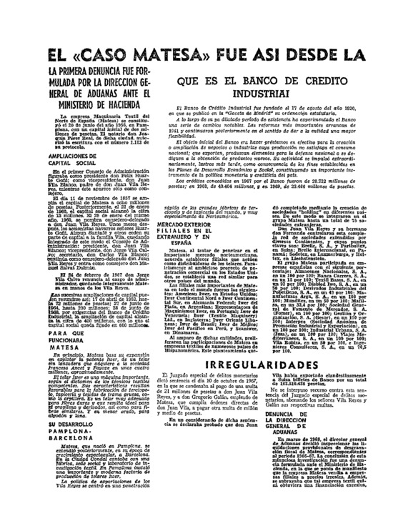 El escándalo estalló el 23 de julio de 1969 cuando Víctor Castro Sanmartín, director general de Aduanas, denunció a Matesa, Maquinaria Textil del Norte S.A. ante el Tribunal de delitos monetarios, que intervino la empresa y encarceló al principal accionista de la sociedad, Juan Vilá Reyes, así como a otros accionistas y directivos. Al parecer Matesa, fundada en 1956 como una empresa familiar, mantenía una deuda de 10.000 millones de pesetas con un banco público (el Banco de Crédito Industrial, dirigido por José González Robatto). La empresa había adquirido en 1957 la patente francesa Ancet-Fayolle de un telar sin lanzadera (presentado por primera vez en la Feria Textil de Lyon y rebautizado por la empresa como Iwer), capaz de tejer cualquier clase de material, desde papel hasta fibra de vidrio.